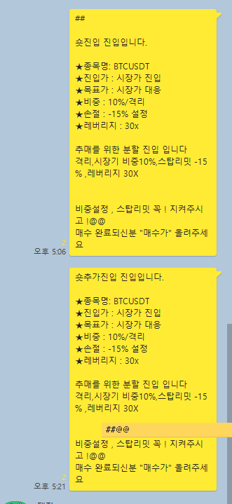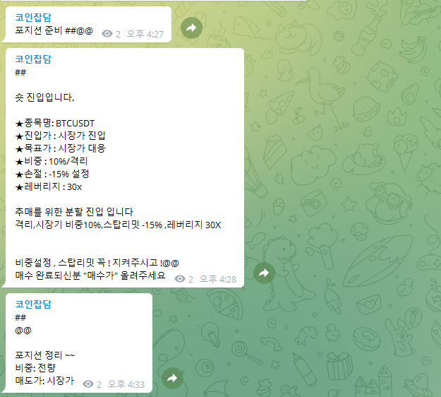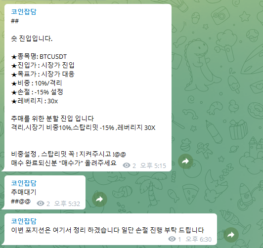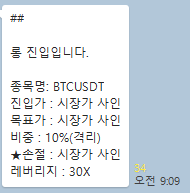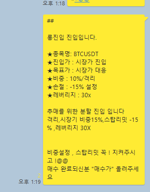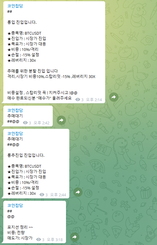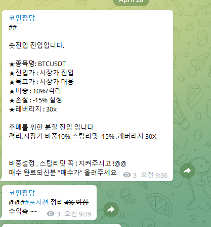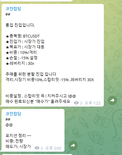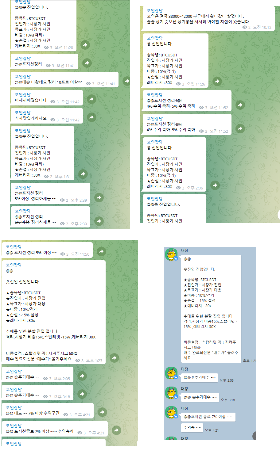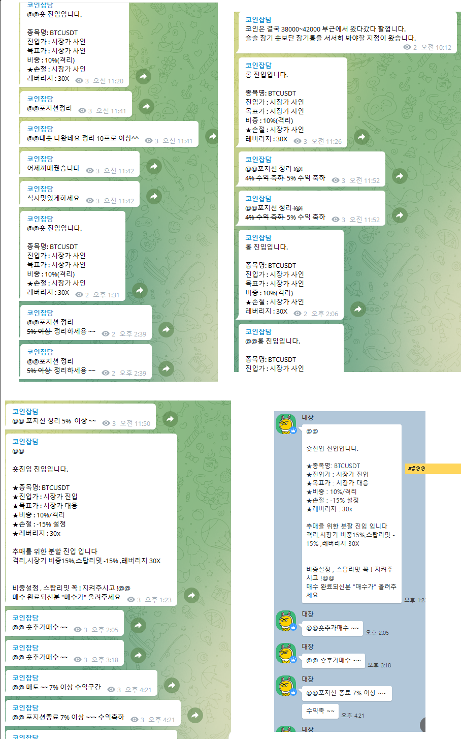 시그널 방은 단타위주 리스크관리 + 매수매도 포지션 안내로 평균 85%이상 타율 나오고 있으며, 텔레그램 입장시 모든 전적 확인 가능하시니 참고 바랍니다 ~