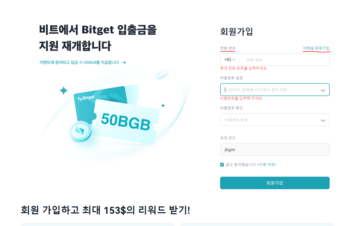 모바일 이메일 두개로 가입이 가능한대요, 일단 아무거나 선택하시고 ! 인증코드 받기를 누르시면 이런 화면이 뜨는데요!